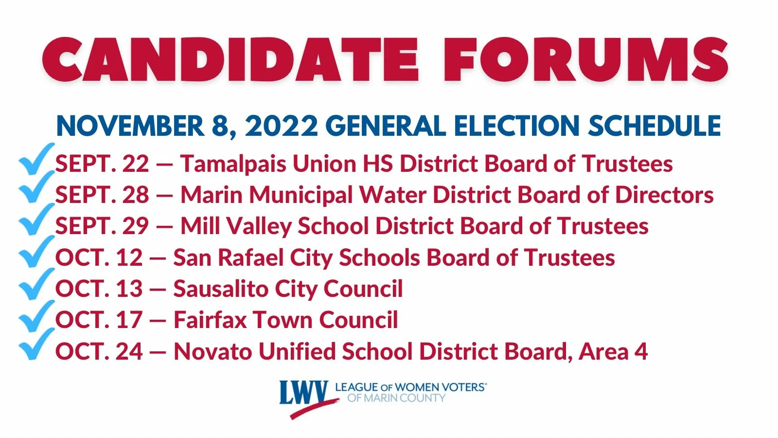 The League of Women Voters of Marin County partnered with community organizations to provide candidate forums to engage and educate voters prior to the November 8, 2022 General Election. As a non-partisan organization, the League does not support or oppose any political party or candidate for public office.
