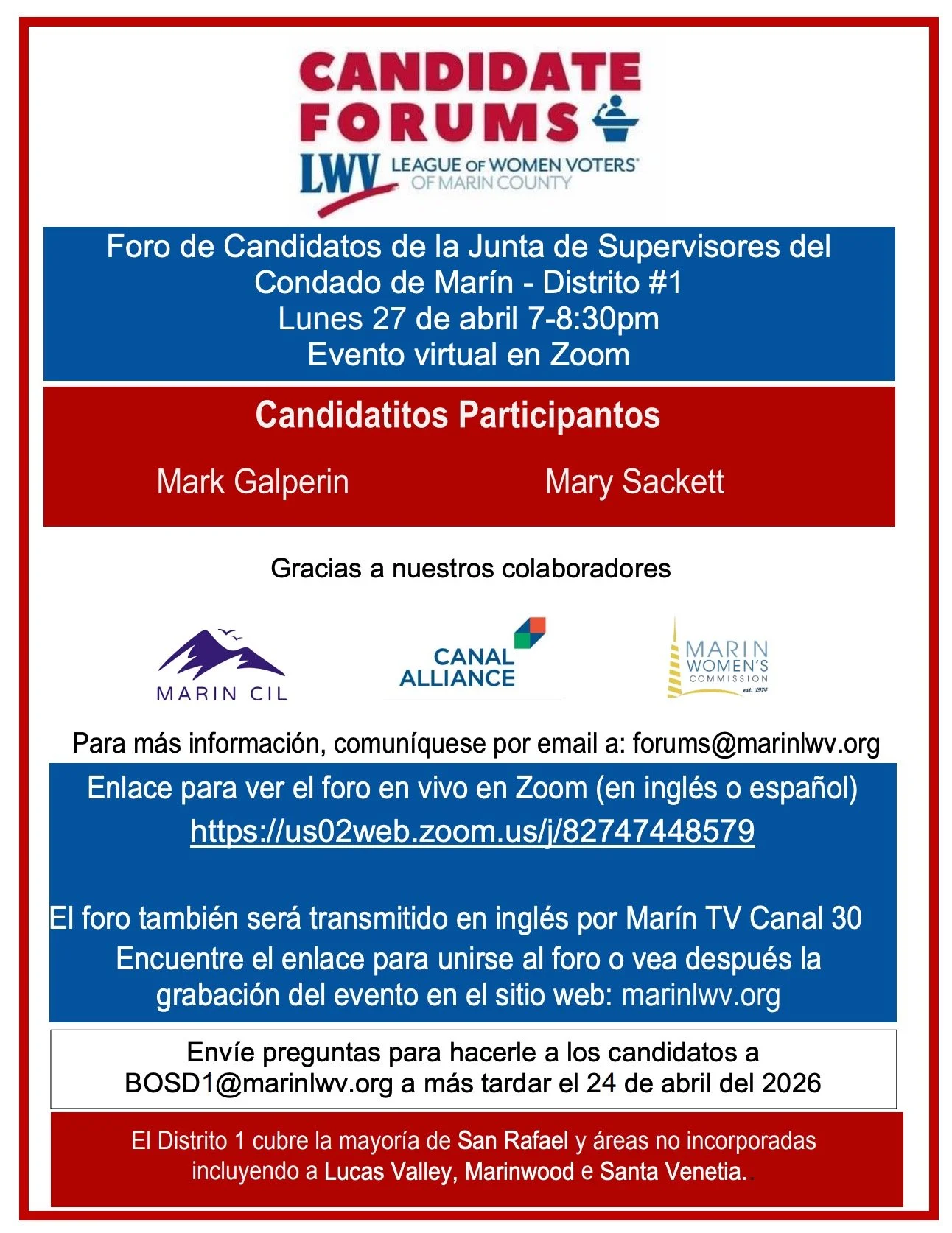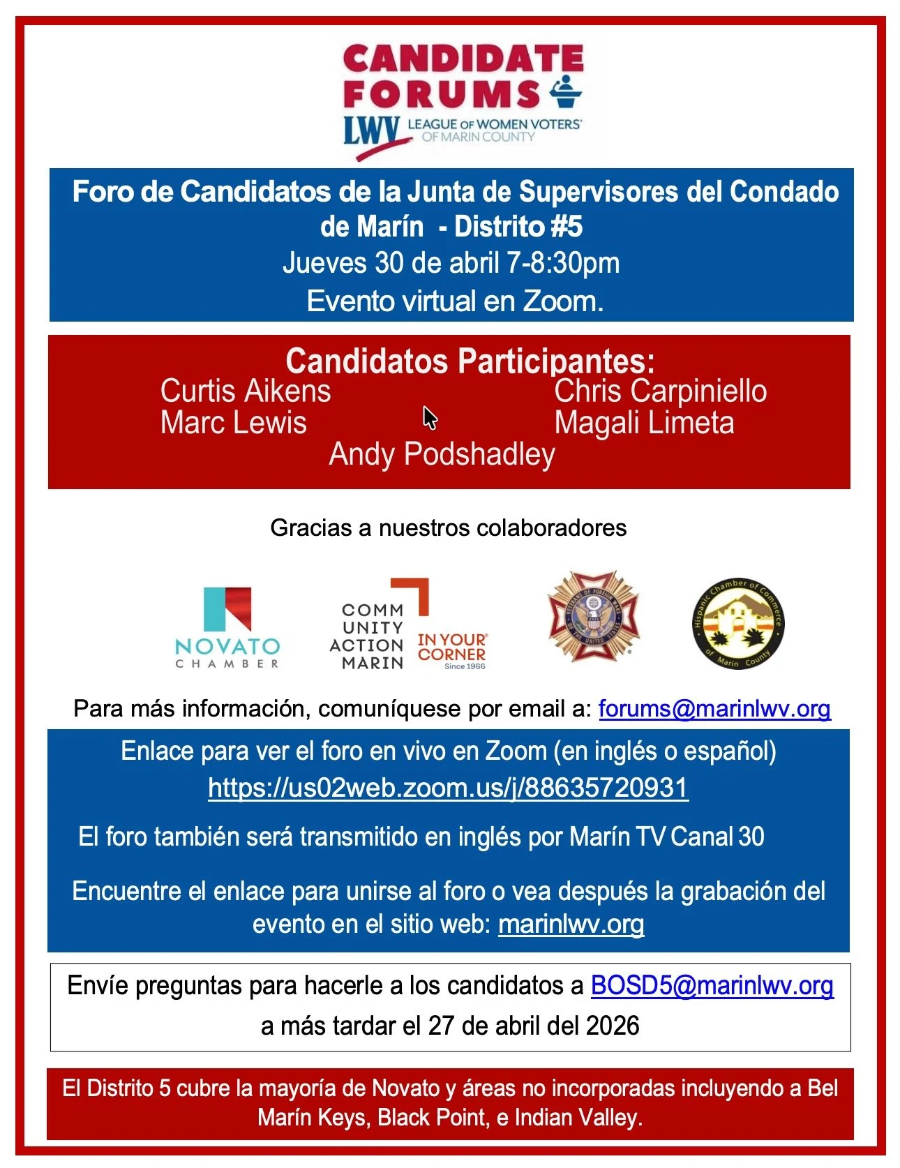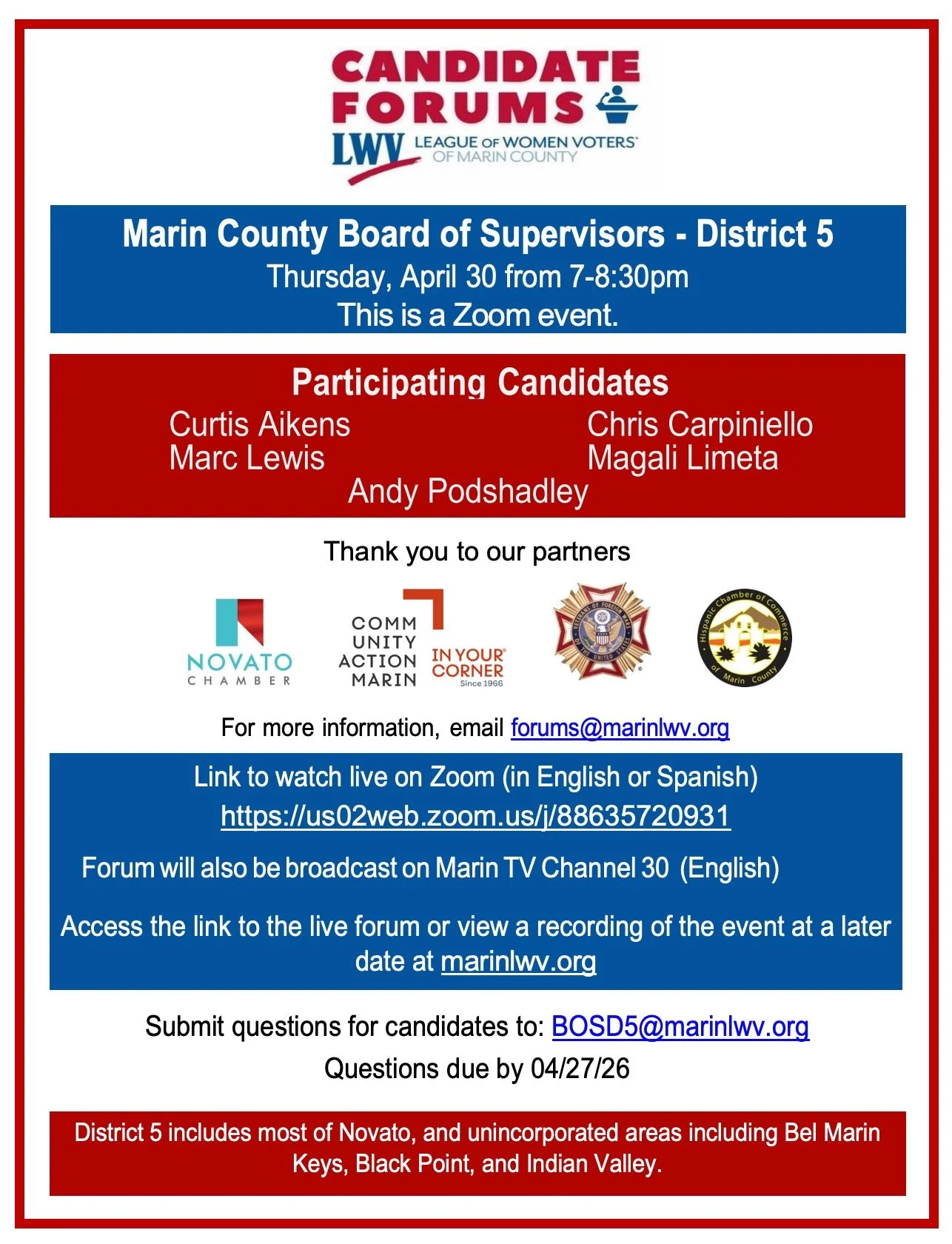 Submit questions for candidates to: BOSD5@marinlwv.org Questions due by 04/27/26