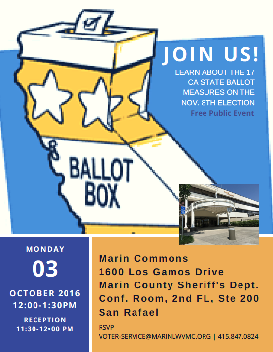 Everyone is invited to attend the LWVMC presentation of the November 8 election Ballot Measure Pros/Cons.