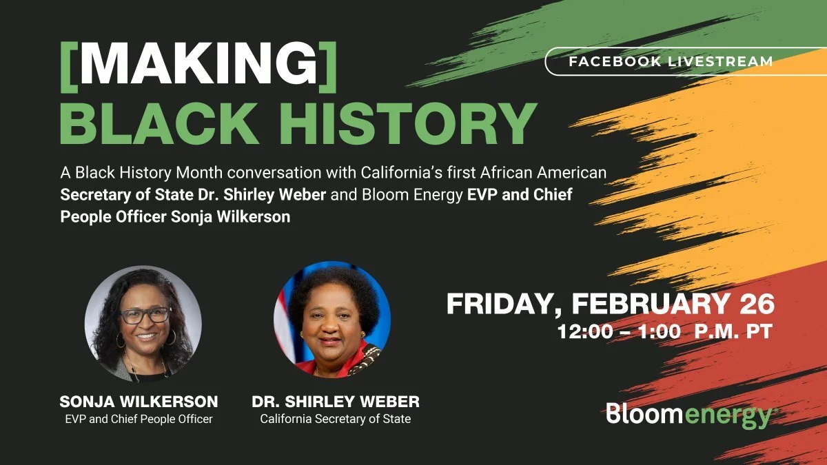 Black History Month Conversation : CA Sec of State Friday, February 26, 2021 12:00 PM 1:00 PM 12:00 13:00 USA (map) Google Calendar ICS #BlackHistoryMonth conversation with California Secretary of State @DrWeber4CA and Bloom Energy Chief People Officer Sonja Wilkerson on differences in privilege, diverse leadership, and empowering minority communities. https://hubs.li/H0H99Bq0