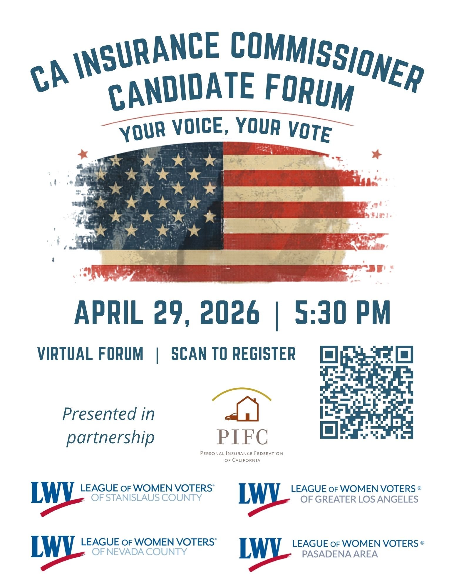 The League of Women Voters (LWV) of Stanislaus County, in partnership with the LWV of Greater Los Angeles, LWV of Nevada County, LWV of Pasadena Area, and the Personal Insurance Federation of California, are partnering to host a virtual candidate forum for the office of California Insurance Commissioner. The event will be Wednesday, April 29th starting at 5:30 pm. See flyer.