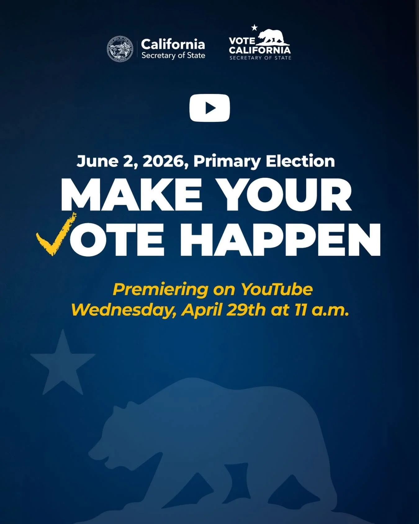Join Secretary of State, Shirley N. Weber, Ph.D., and the Elections Division team on Wednesday, April 29th at 11 a.m. for a virtual event: Make Your Vote Happen: What’s on Your Ballot and Voter Resources (on YouTube)