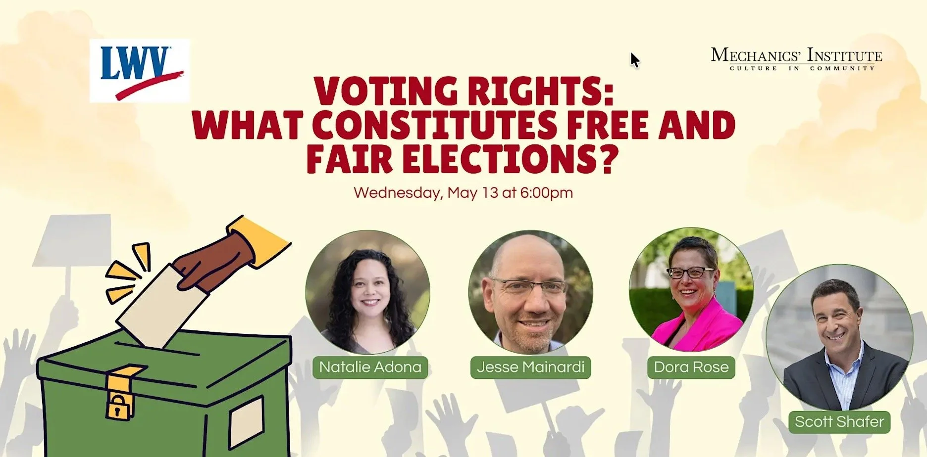 The League of Women Voters of California and the Mechanics' Institute will present this panel of elections experts — Natalie Adona, Marin's Registrar of Voters; Jessie Mainardi, election law expert and UC Law San Francisco professor; and Dora Rose, Deputy Director of the League of Women Voters of California — discussing the evolving landscape of voter access and election protection. Register here. For League members who cannot attend but have registered, a link to the recording will be sent after the event.
